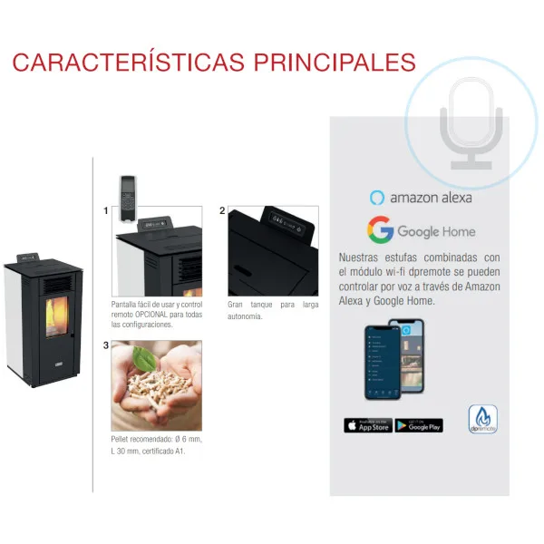 Doppelte Verbrennung, Umluft, kompakte Abmessungen, einfache Wartung, programmierbar, Gusseisen-Kessel, integrierter Raumsensor, sehr leise, herausnehmbarer Aschebehälter, Rauchrohranschluss hinten.